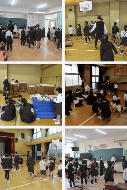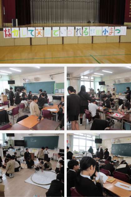 たてわり班の教室に集まり、明日の「野田小まつり」で、班のみんなが出店するゲームのお店の準備をしました。