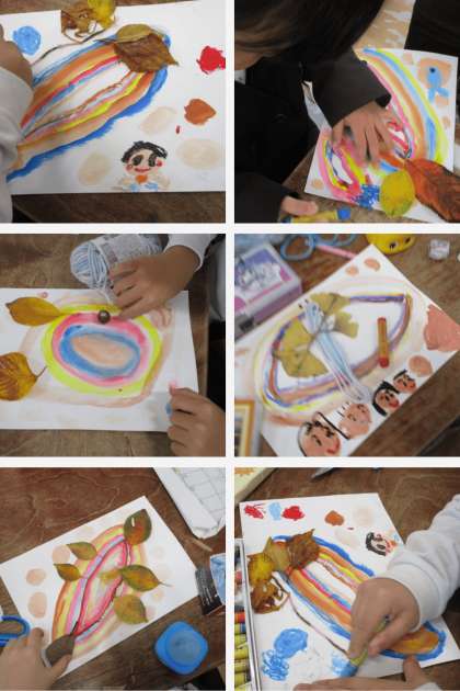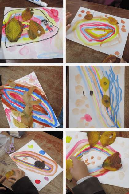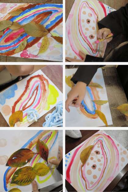 昨日は、絵の具を使ってきれいな模様を描きましたが、今日は、その絵に秋のはっぱなどをはりつけて仕上げました。