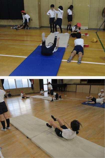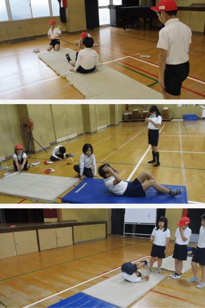 体育科の時間は、マット運動のいろいろな技に挑戦しています。