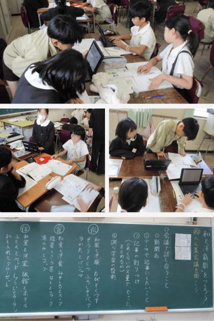 国語科の時間は、「くらしの中の和と洋」で学習した内容を生かしながら、身の回りにある「衣・食・住」の和と洋について調べ、新聞にまとめていきます。