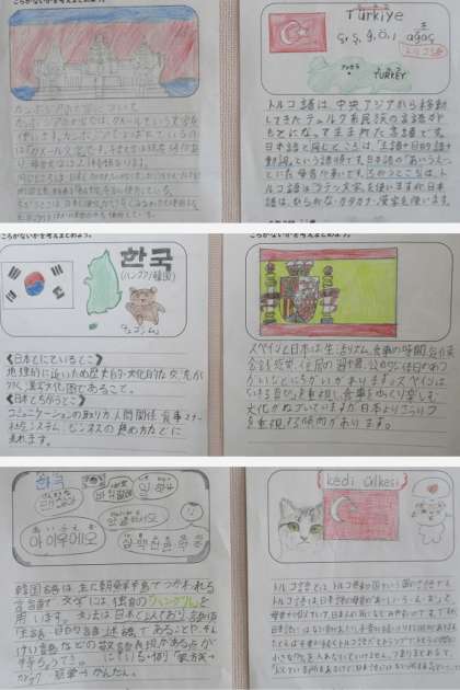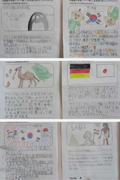 外国語の言葉について調べ、日本語と同じところやちがうところがないかを考えてまとめました。