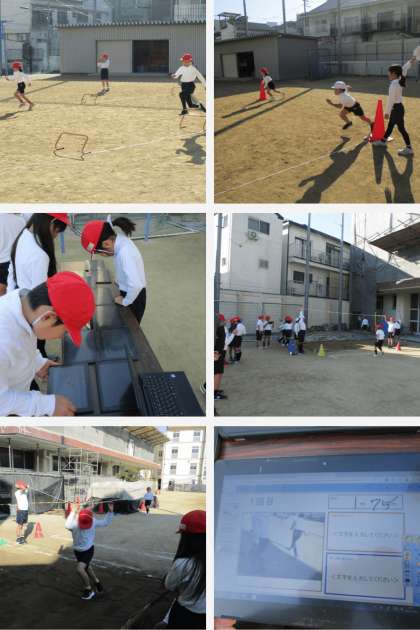 学習用端末を使って、ハードルを跳ぶようすと、幅跳びのようすを動画に撮影して、どのようにすればうまく走ったり跳んだりすることができるか確認しました。