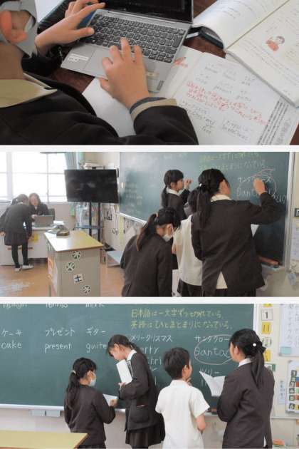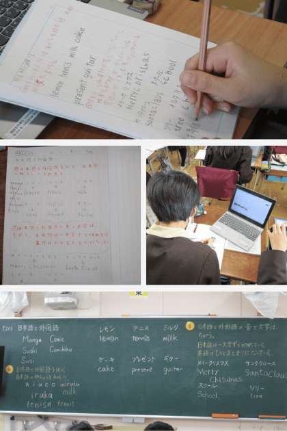 国語科の時間は、日本語と外国語の音や文字について調べ、日本語にはどんな特徴があるのか考えました。