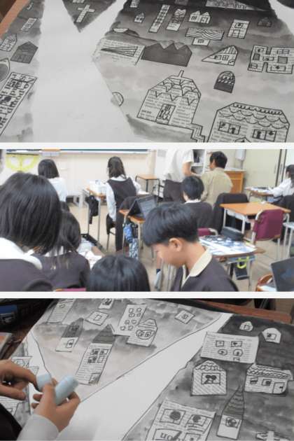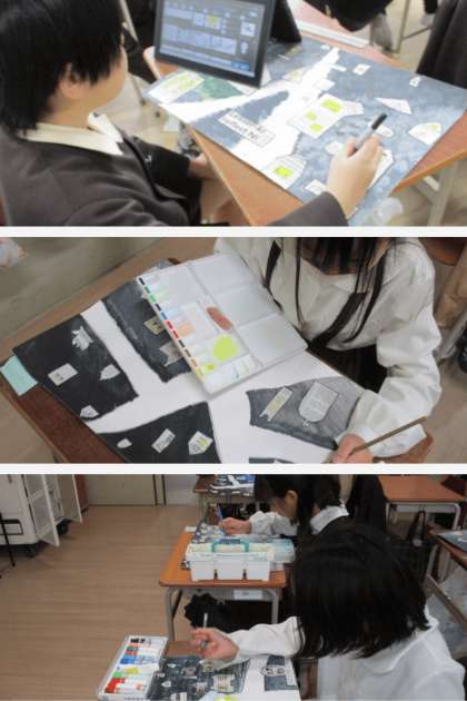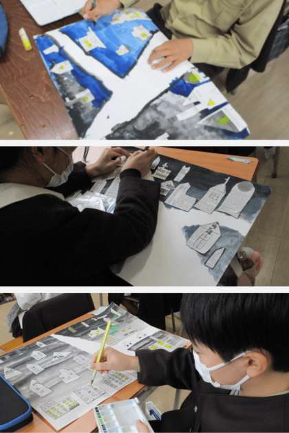 図工科の時間は、「夜の異国の街」をテーマに作品を描いています。