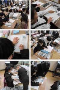 音楽科の時間は、手拍子をしたり、いすなどをたたいたりしながら、2つのパートに分かれて和太鼓のリズムを練習しています。
