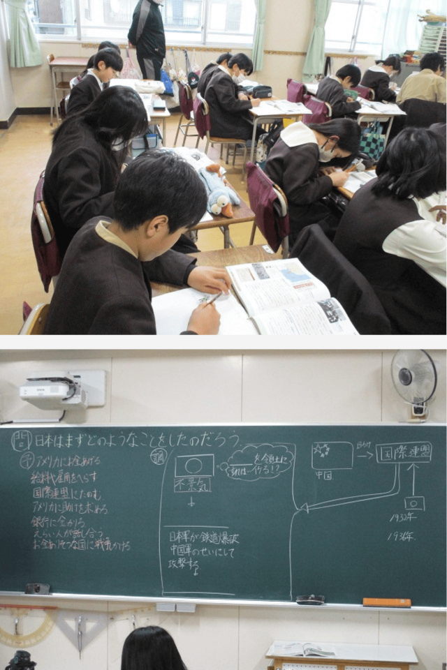 社会科の時間は、第二次世界大戦時の日本と世界の関係について知り、日本がアメリカに対して戦争を起こした理由について、資料をもとに考えていました。