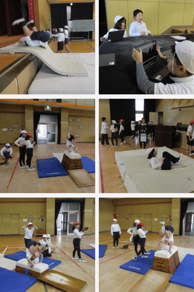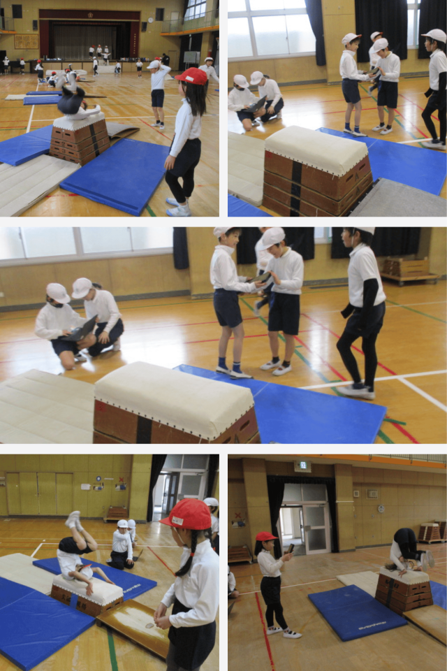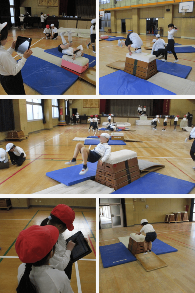 また、タブレットで友達の動きを撮影し、「手をつく位置はどうかな」「体はまっすぐかな」など、画面を見ながら確かめる姿が見られました。