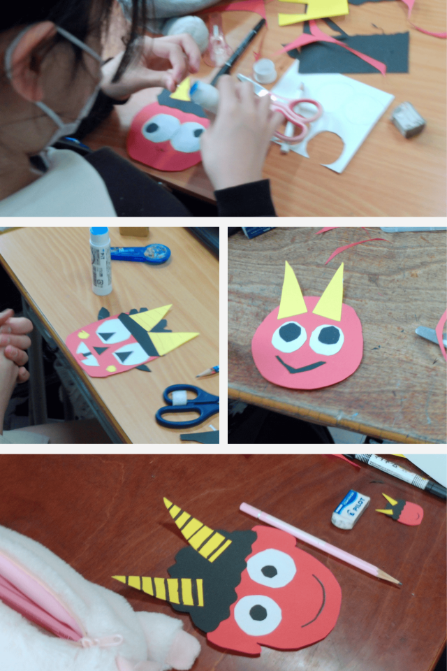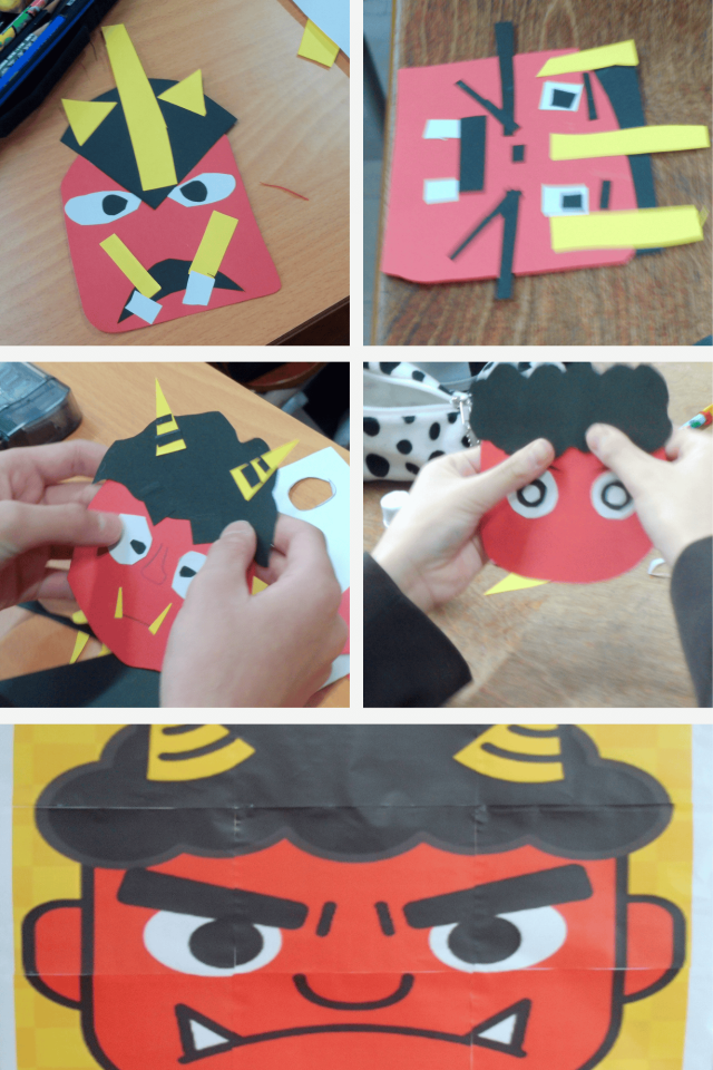 子どもたちは画用紙を使って、思い思いの鬼の顔を作りました。