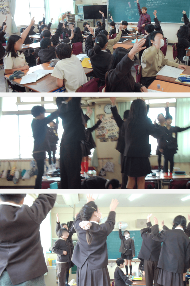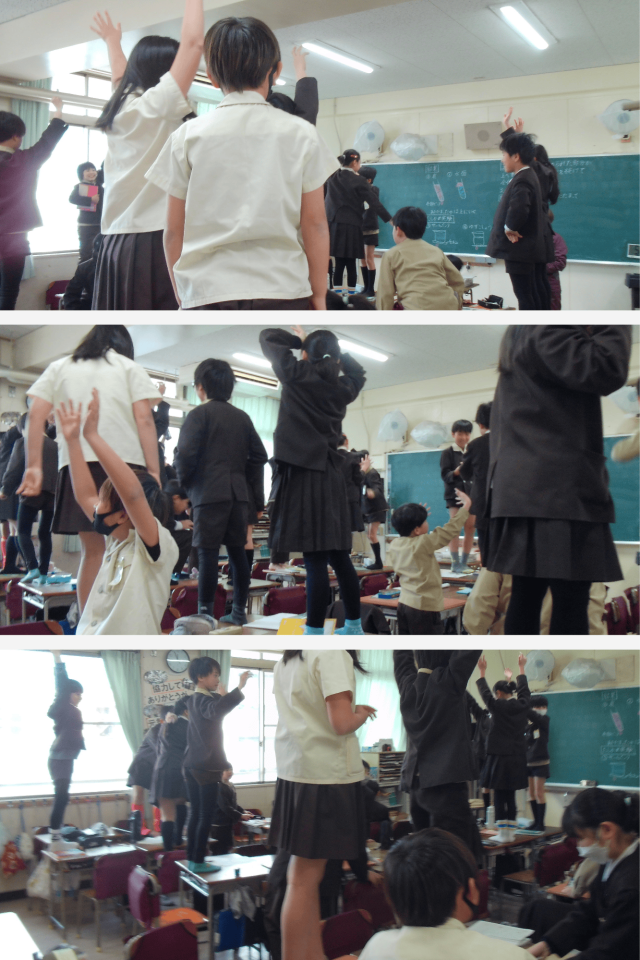 今日は特別に、靴を脱いで机に上がり、教室の上の方の空気の温度と、床に近い下の方の温度とを比べました。