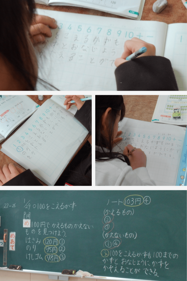 はさみ120円、のり95円、けしゴム78円などを例に、100円で買えるものと買えないものを考えました。