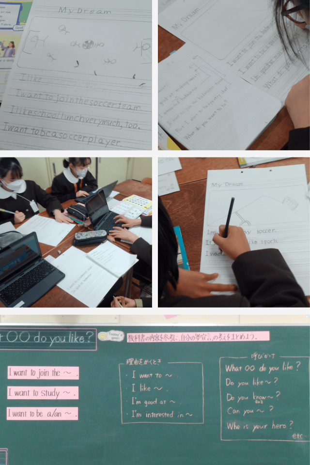 学習の中では、"I want to 〜."といった表現を使い、自分の夢を言葉にすることに挑戦しました。