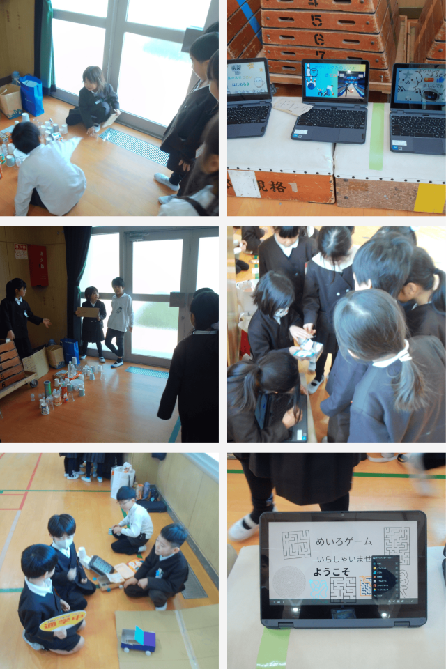 また、学習者用端末を使ってCanvaで作ったお店の紹介や遊び方のルール説明を画面に出し、1年生に分かりやすく伝えていました。