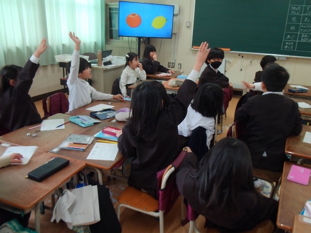 モニターに映し出された果物をじっと見つめ、色や形、味の違いを一生懸命に考えていきます。積極的に挙がる手の多さからは、難しい課題にも恐れず挑戦する意欲が伝わってきました。