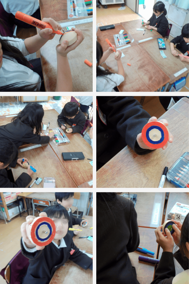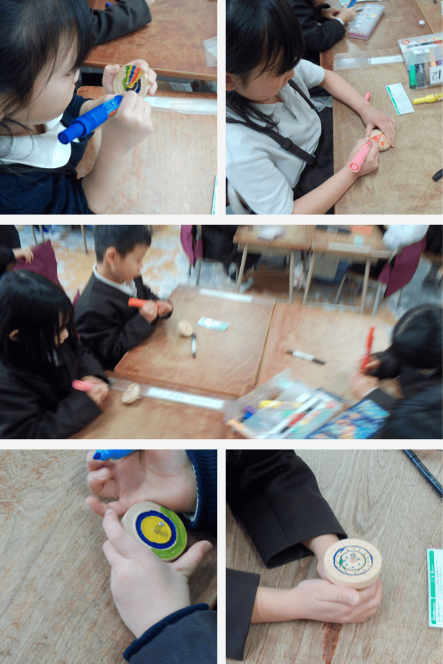 図工の時間に、こまに絵を描く学習を行いました。