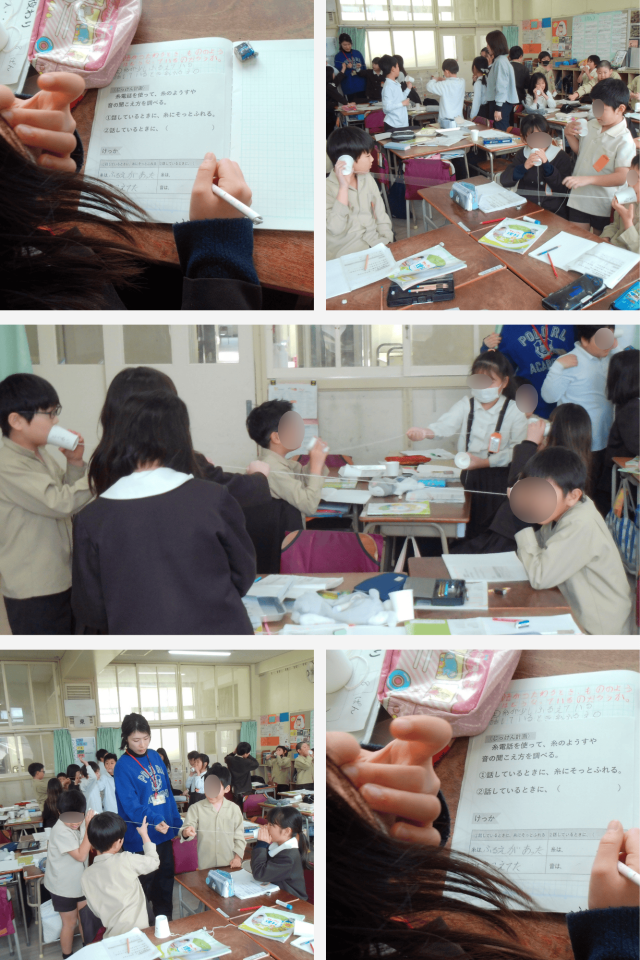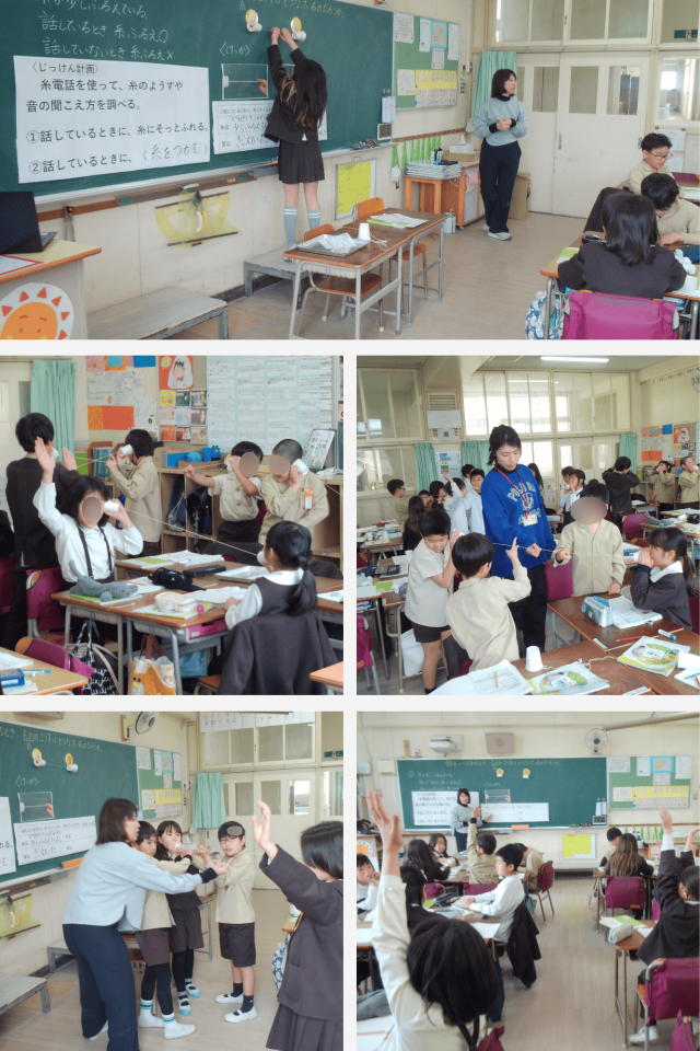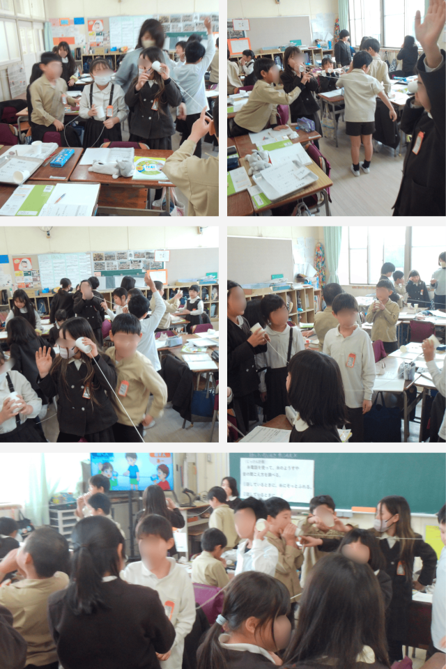 糸電話を使い、声を出したときに糸がどのようなようすになるのかを確かめました。