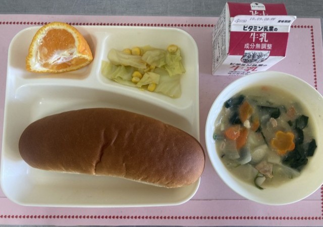 2/19(木)の給食は、ごはん、牛乳、豚肉と干しずいきのみそ煮、五目汁、焼きじゃがです。