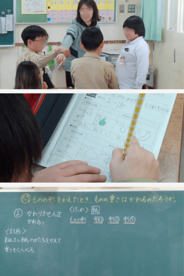 理科の学習で、「ものの形をかえたとき、ものの重さはかわるのだろうか」という問いについて実験で調べました。