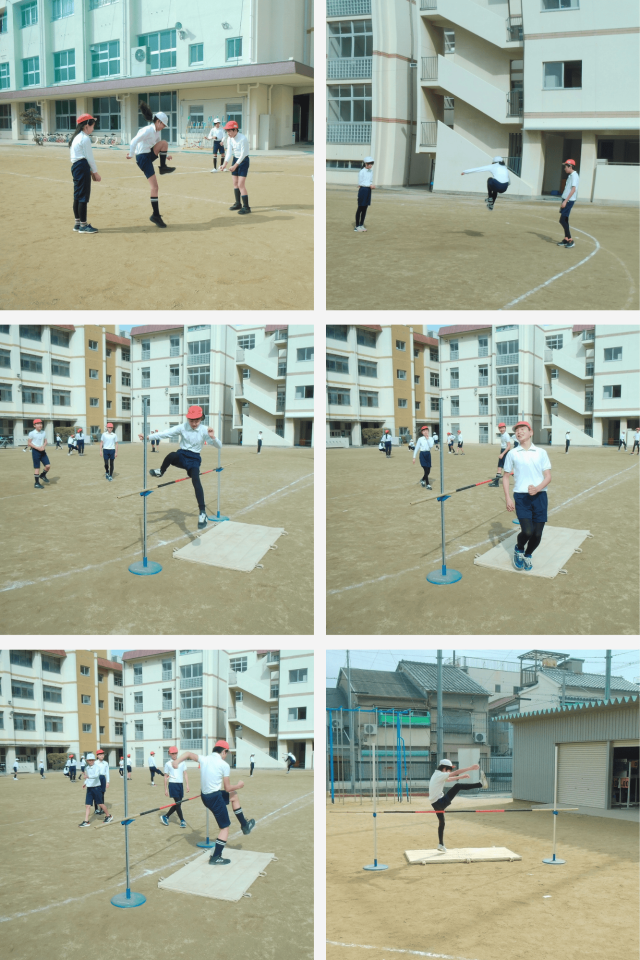 体育の時間に、走り高跳びの練習に取り組んでいます。