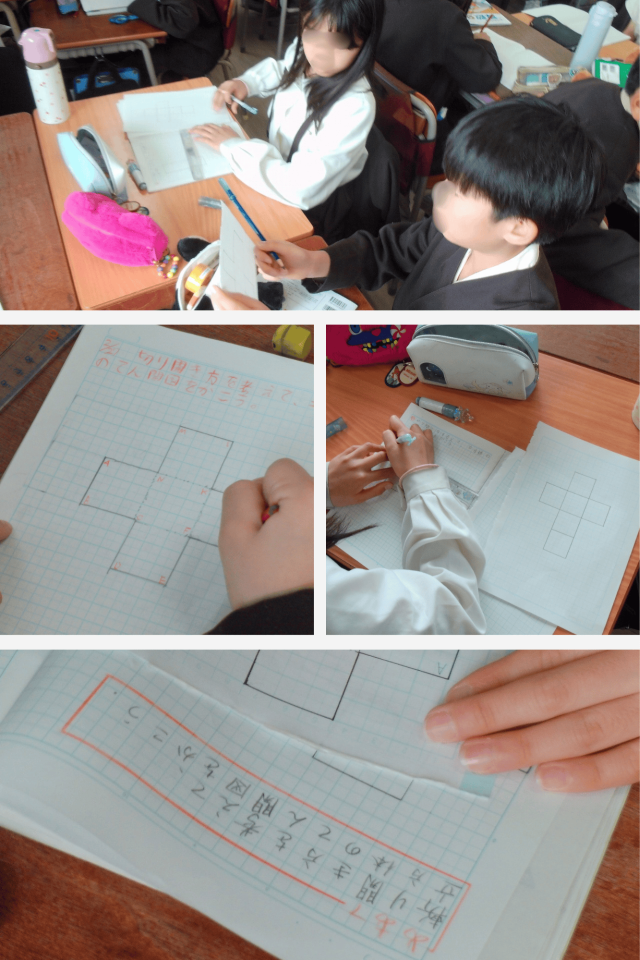 方眼紙に自分なりに考えた展開図をていねいにかき、実際に組み立てて確かめる活動を行いました。