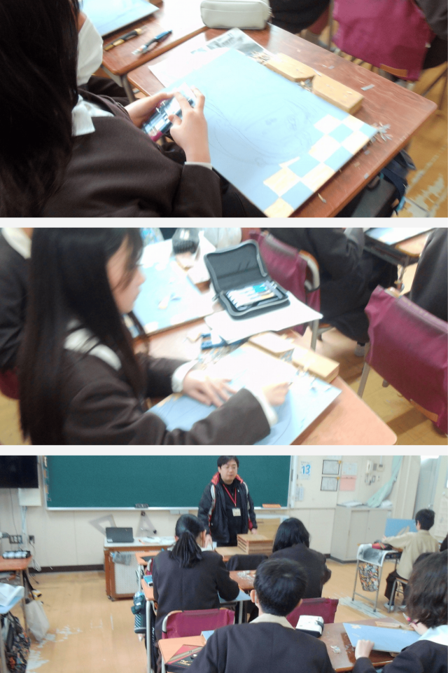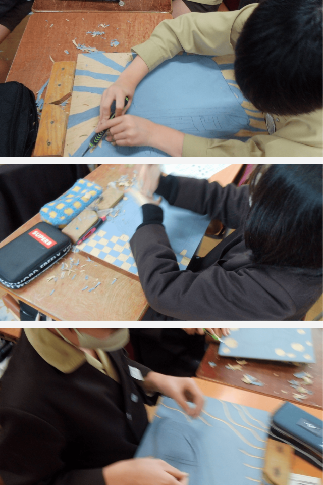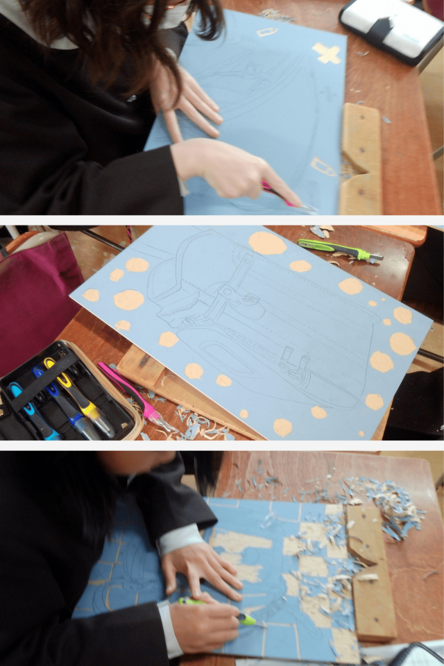 彫刻刀の扱い方や安全にも気を付けながら、集中して取り組んでいます。