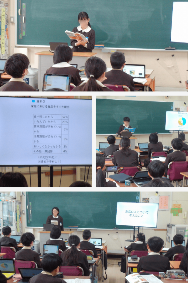 子どもたちは、食品ロスの量や内訳、家庭やお店での現状などを示した資料を読み取り、そこから分かることや気付いたことを整理、数字やグラフを根拠にしながら考えを深めていきました。