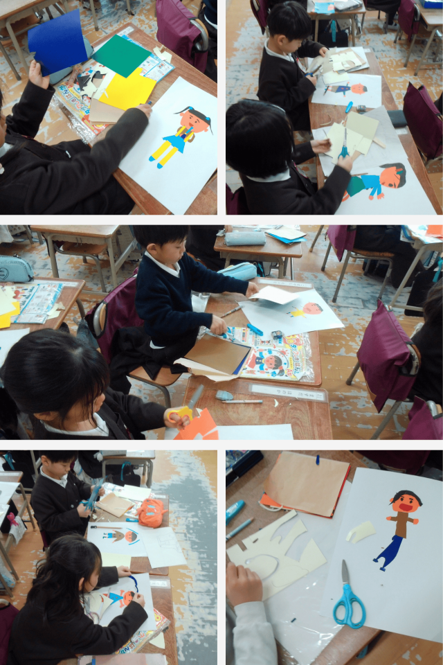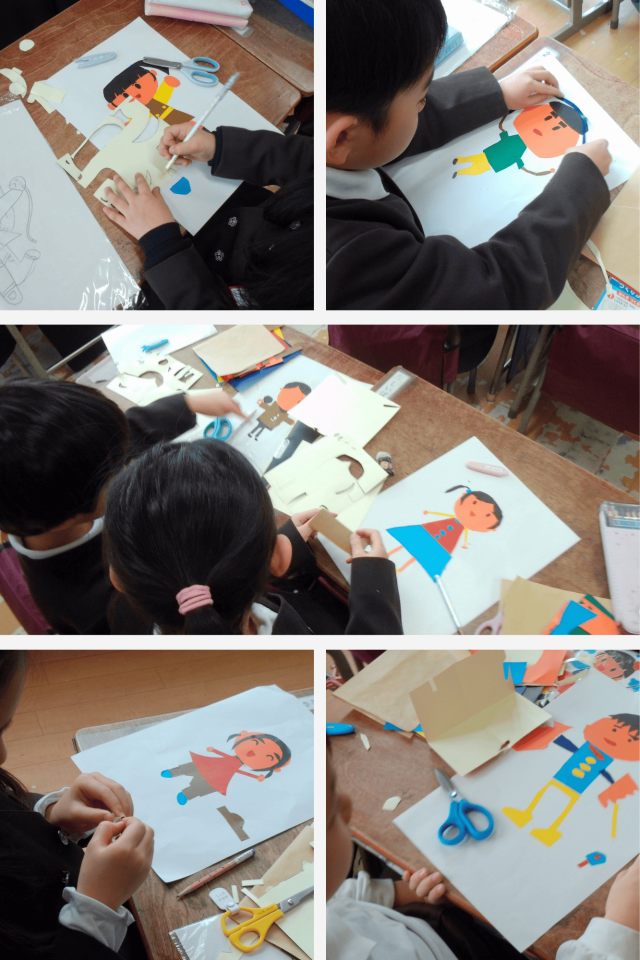 子どもたちは、はさみを使って思い思いの形を切り取り、「この色をここに置いたらきれいかな」「こんな形にしてみよう」と、色や形の組み合わせを楽しみながら版を作っていました。