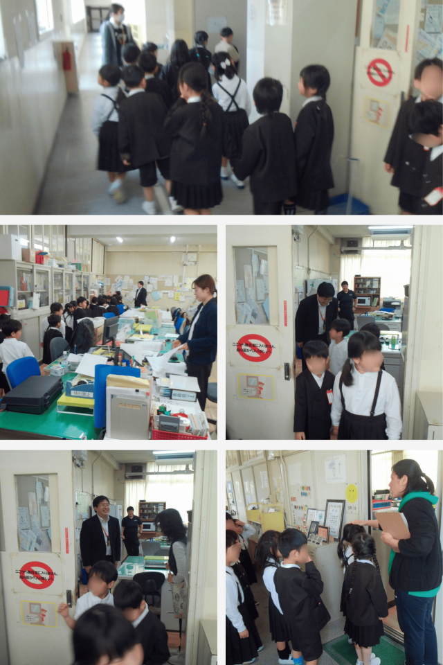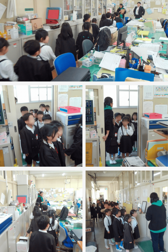 職員室では、「しつれいします」とあいさつをして入ることを教えてもらい、少しきんちょうしながらも、しっかりとあいさつをすることができました。