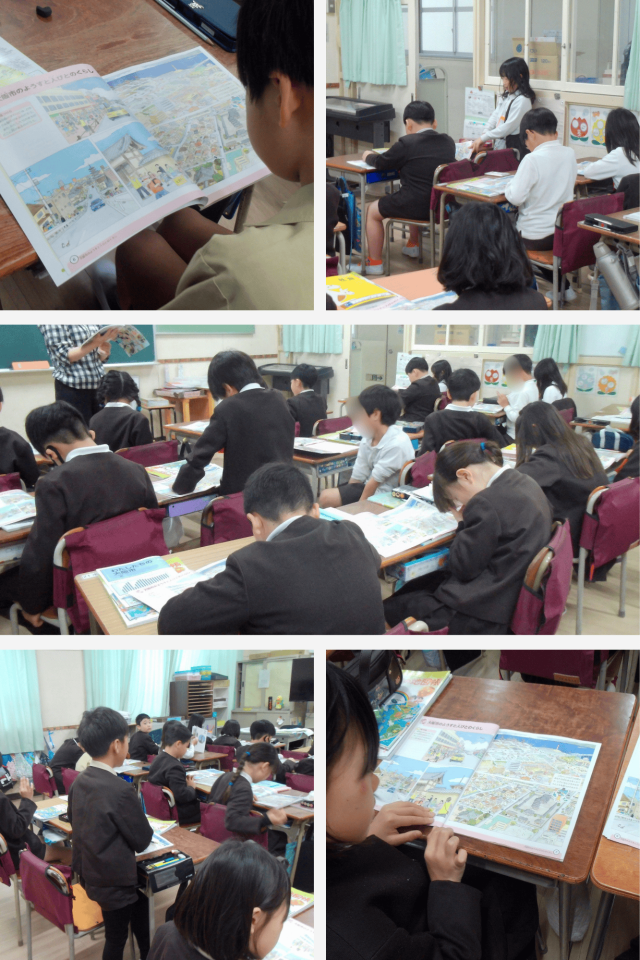 社会科では、教科書に出てくるまちのようすと、自分たちが住んでいるまちをくらべる学習を行いました。