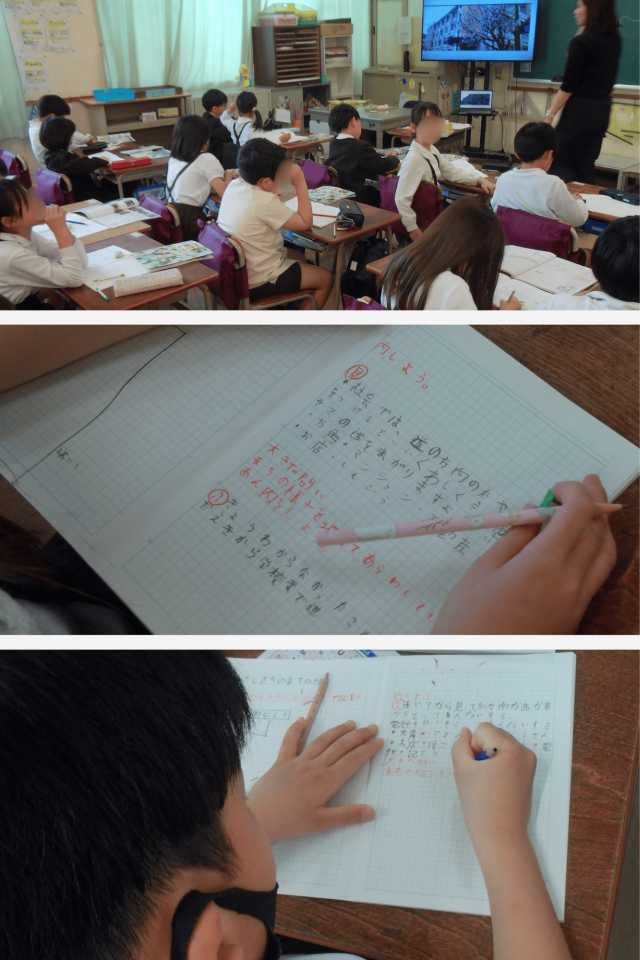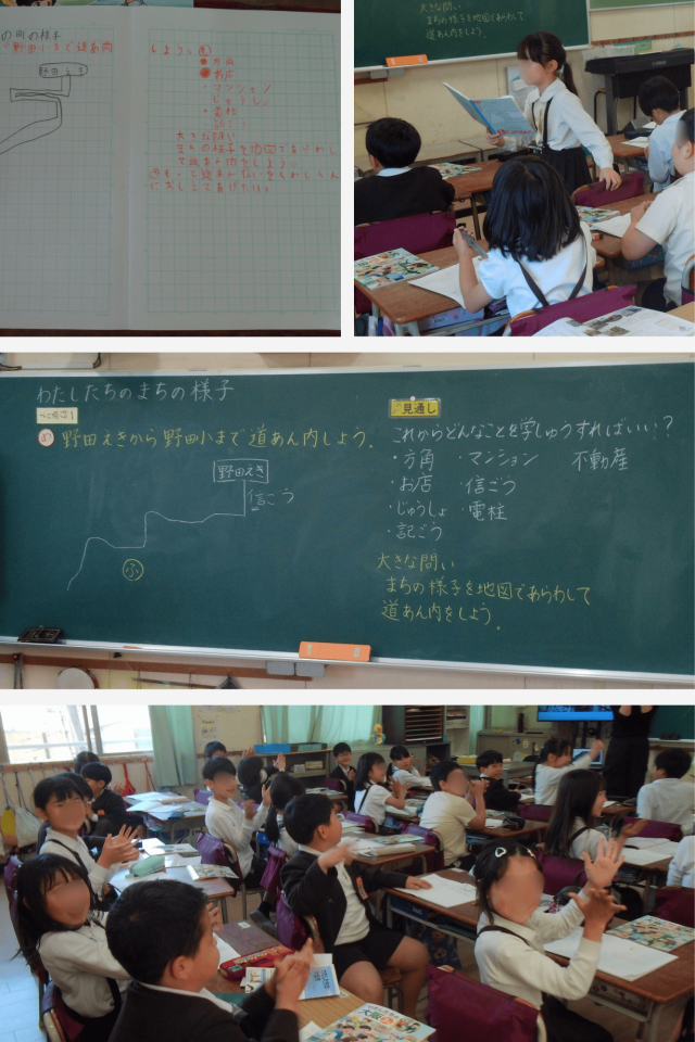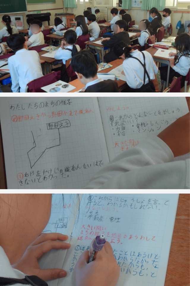 子どもたちは、「どこを目印にするとわかりやすいかな」「道の曲がり方はどう伝えたらいいかな」と考えながら、相手に伝わる地図づくりについて意見を出し合っていました。