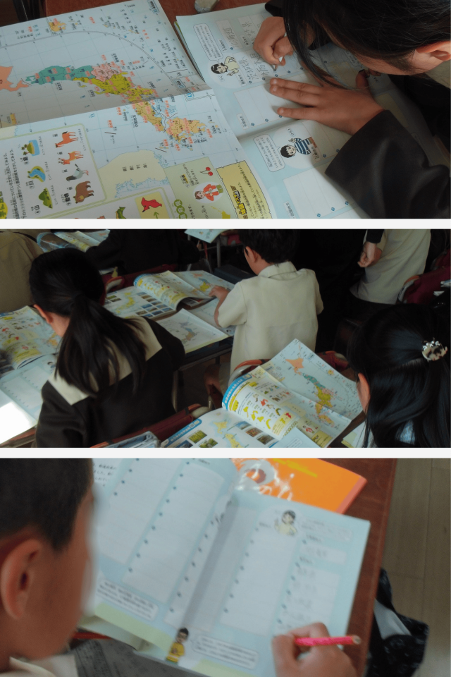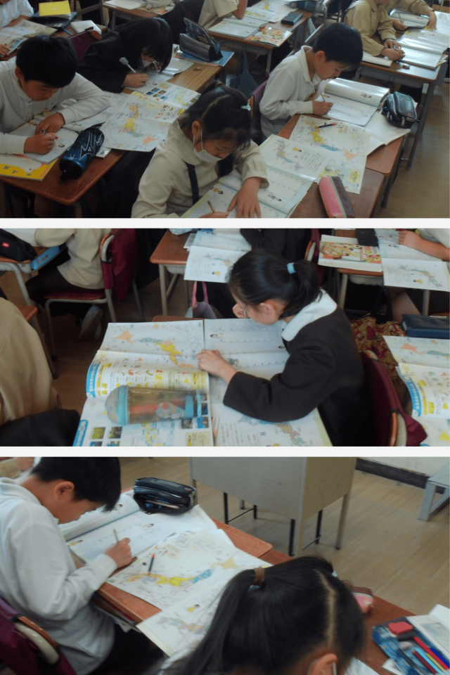 この時間は、地図を見ながら都道府県の名前を調べ、教科書の空欄に書き込んでいきました。
