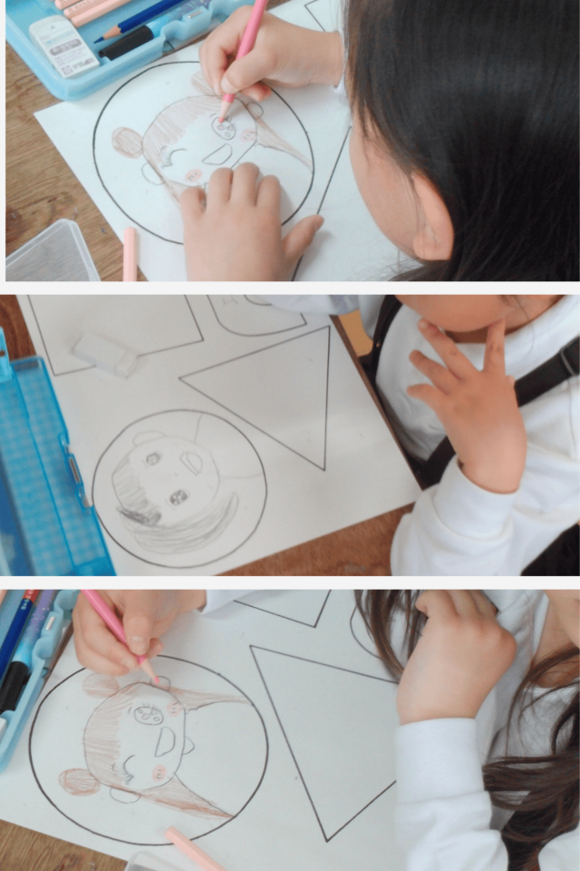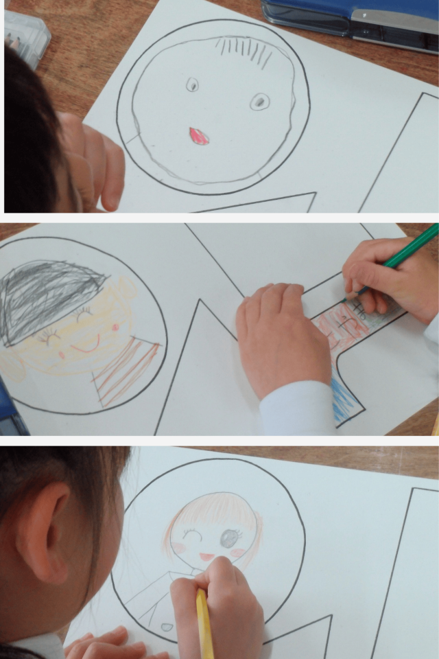 かばんには、自分の好きなもの2つと名前、そして似顔絵を描いています。