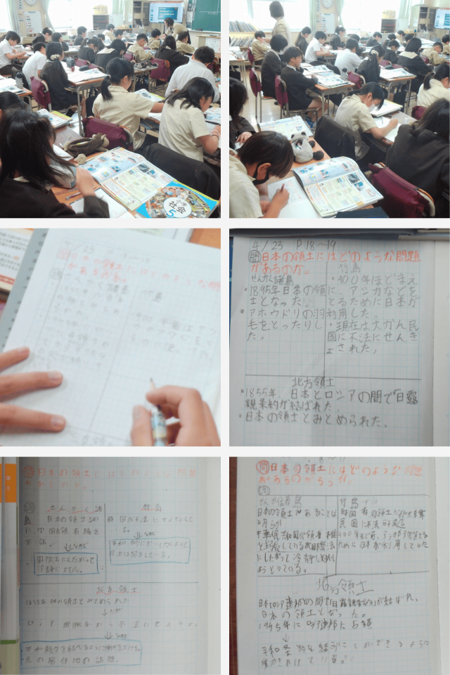 授業では、地図を見ながら日本のまわりにある島々の位置を確かめ、北方領土、竹島、尖閣諸島について調べました。