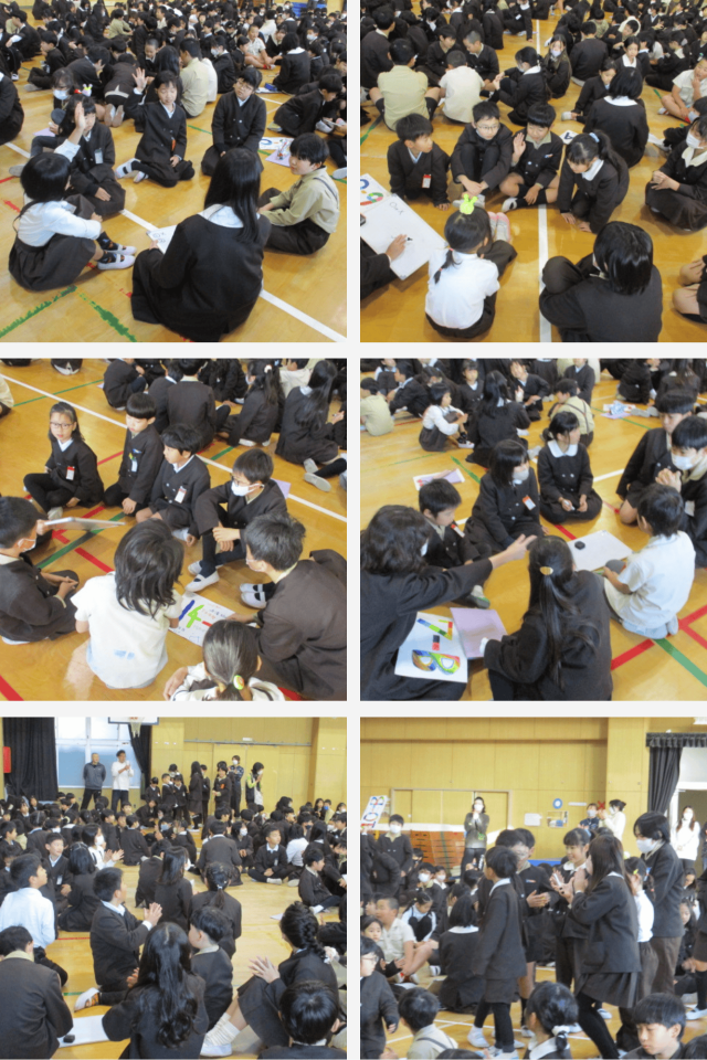 今日の全校朝会は、全校の子どもたちが講堂に集まって行いました。