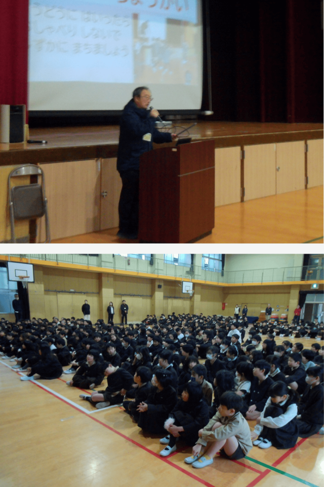 今日の全校朝会は、全校の子どもたちが講堂に集まって行いました。