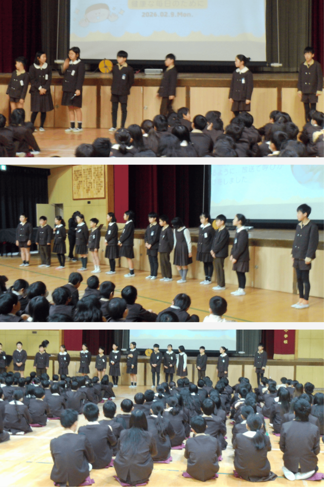 健康委員会の子どもたちが中心となり、手洗いの大切さや正しい方法について、わかりやすく発表しました。