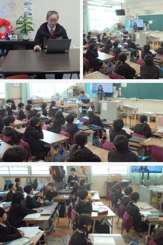 今年度最後の全校朝会は、校長室と教室を結んでオンラインで行いました。