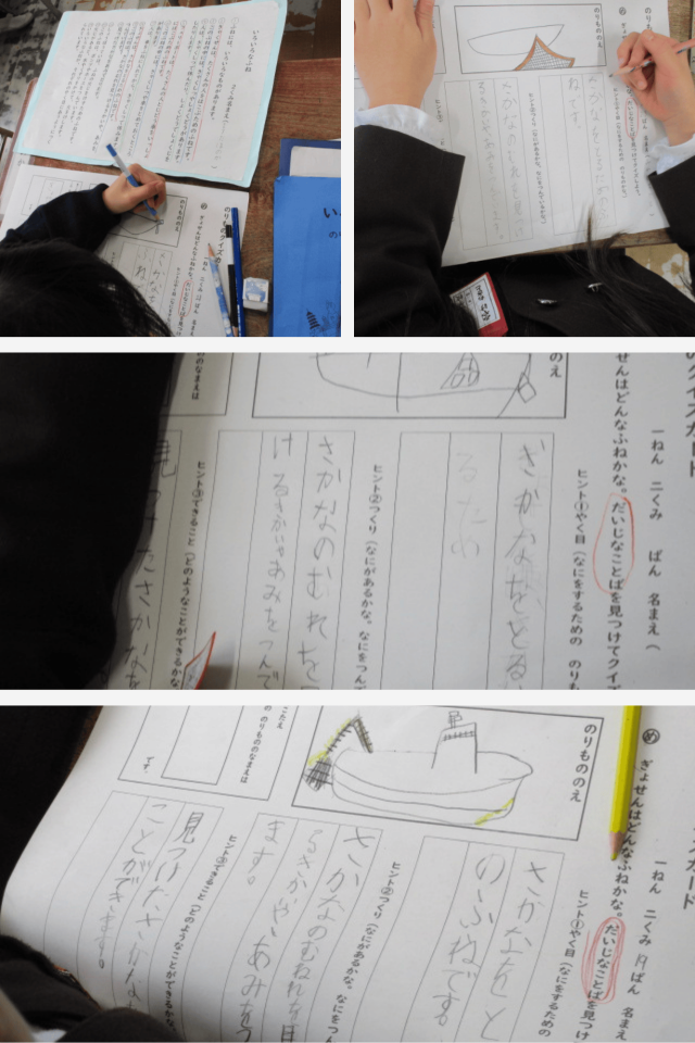 今日は、「ぎょせん」の役目(何をするための船か)、つくり(船の中には何があるのか、何が積んであるのか)、できること(何ができるのか)を、キーワードを見付けながら読み取っていきました。 -