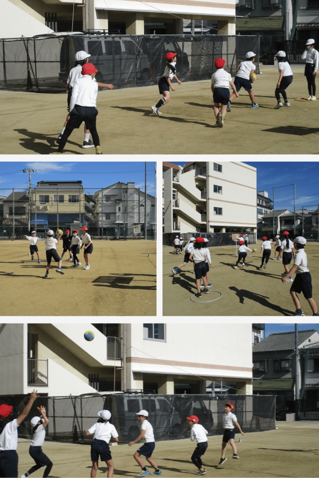 体育科では、「ベースボール型ゲーム」、ティーボールの学習をしました。4チームに分かれて、2つのコートで試合形式で練習をしました。みんなで協力しながら、楽しく学習していました。 -