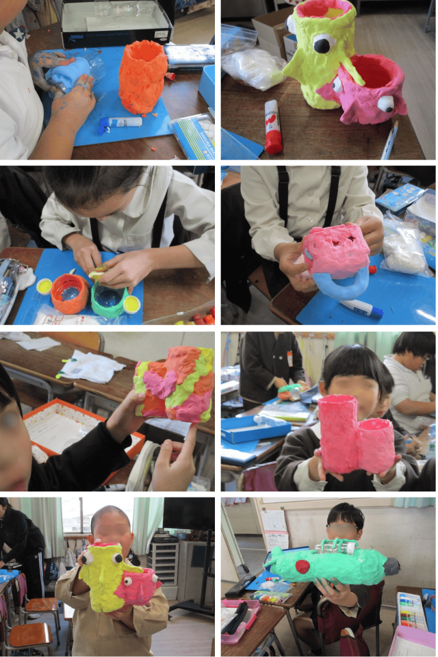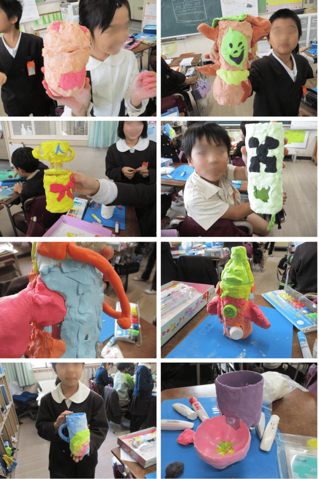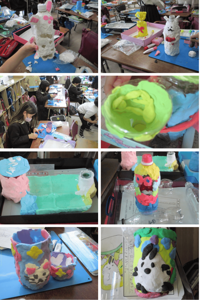 図工科の時間は、カラフルねん土とペットボトルを組み合わせて、楽しく使えるものをつくりました。