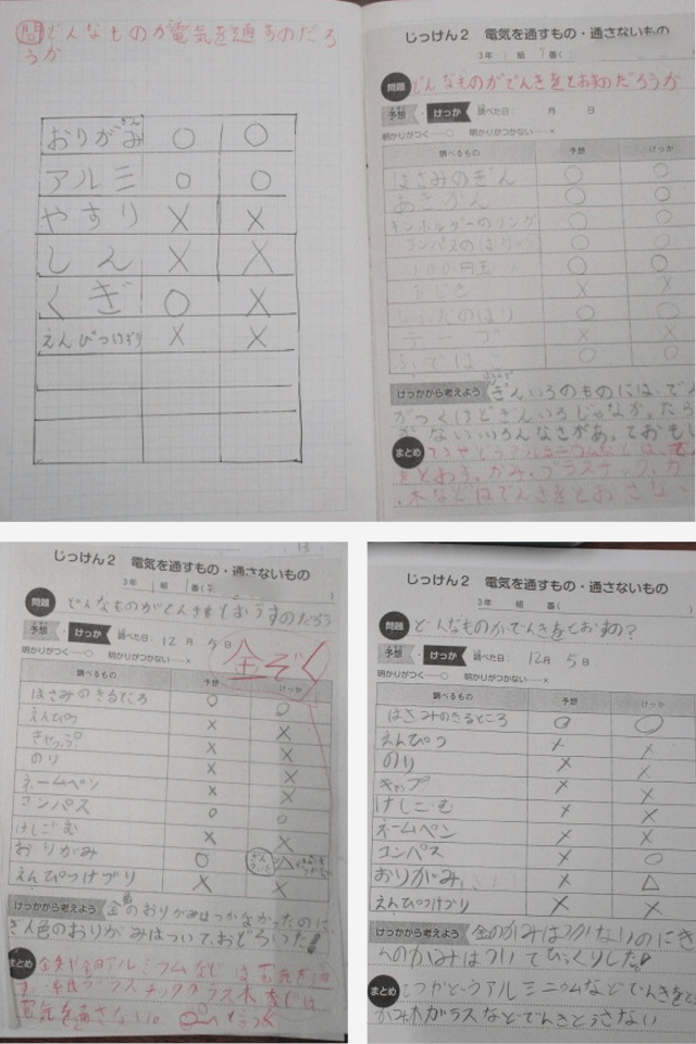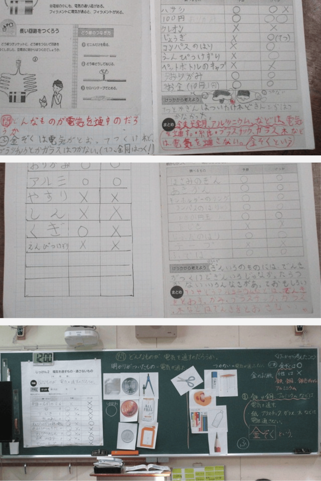 理科の時間は、豆電球と電池の回路の途中にいろいろなものをはさんで、明かりがついたものとつかなかったものに分けました。