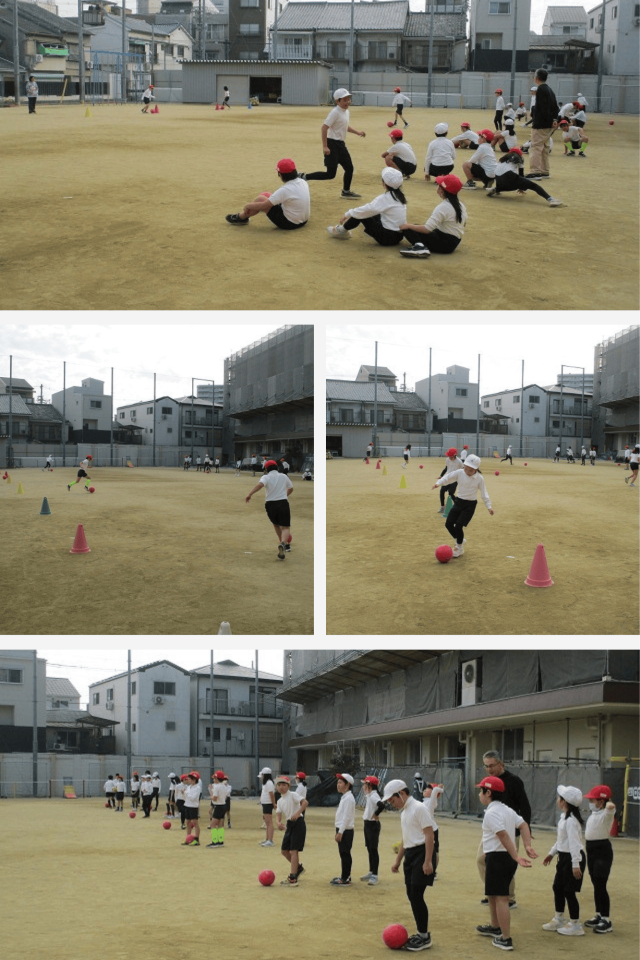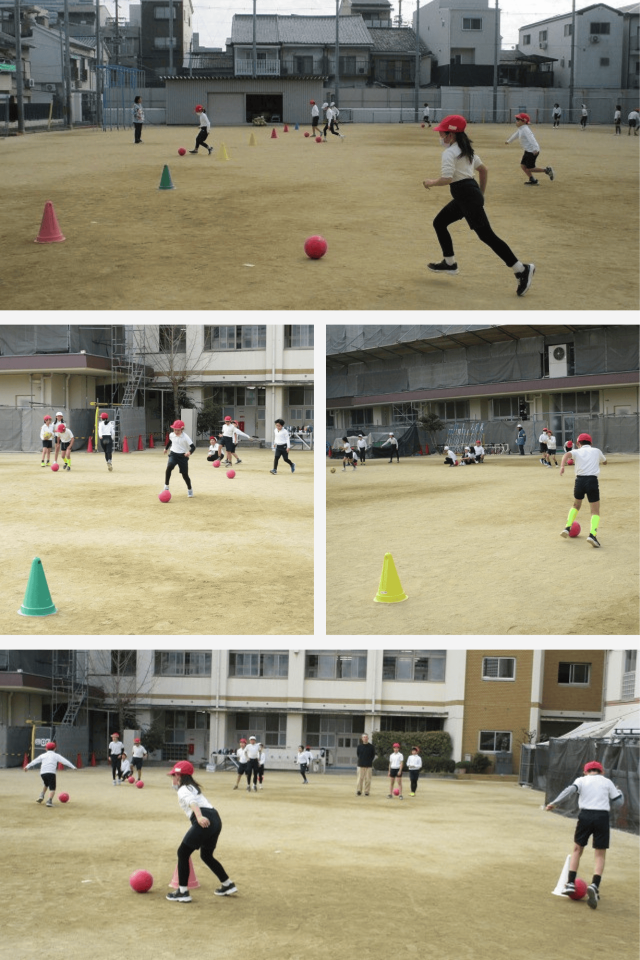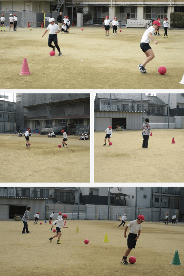 ボールに親しむ運動から始め、パスやドリブルなどの基本的な動きを中心に取り組みました。