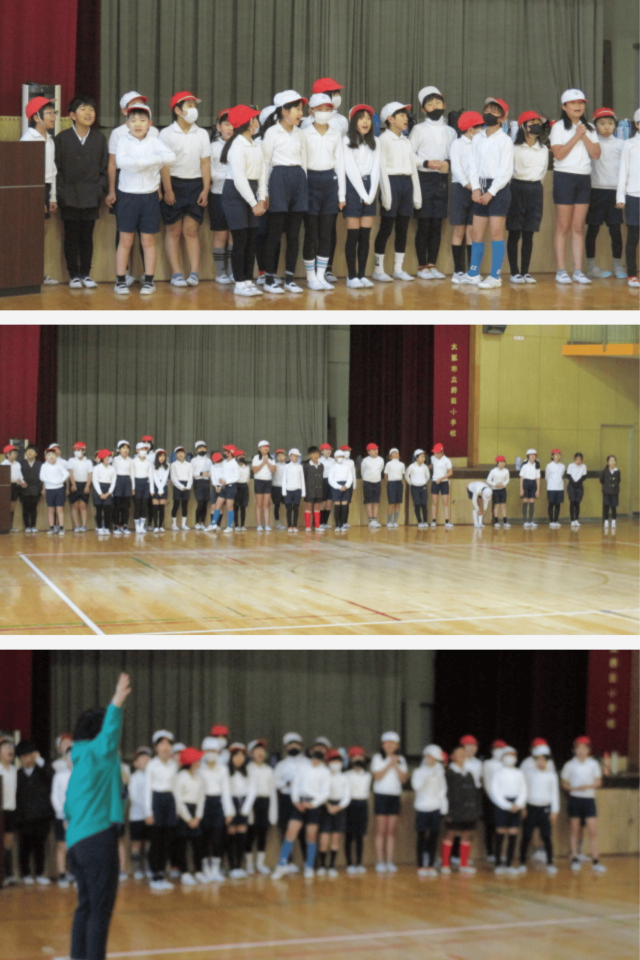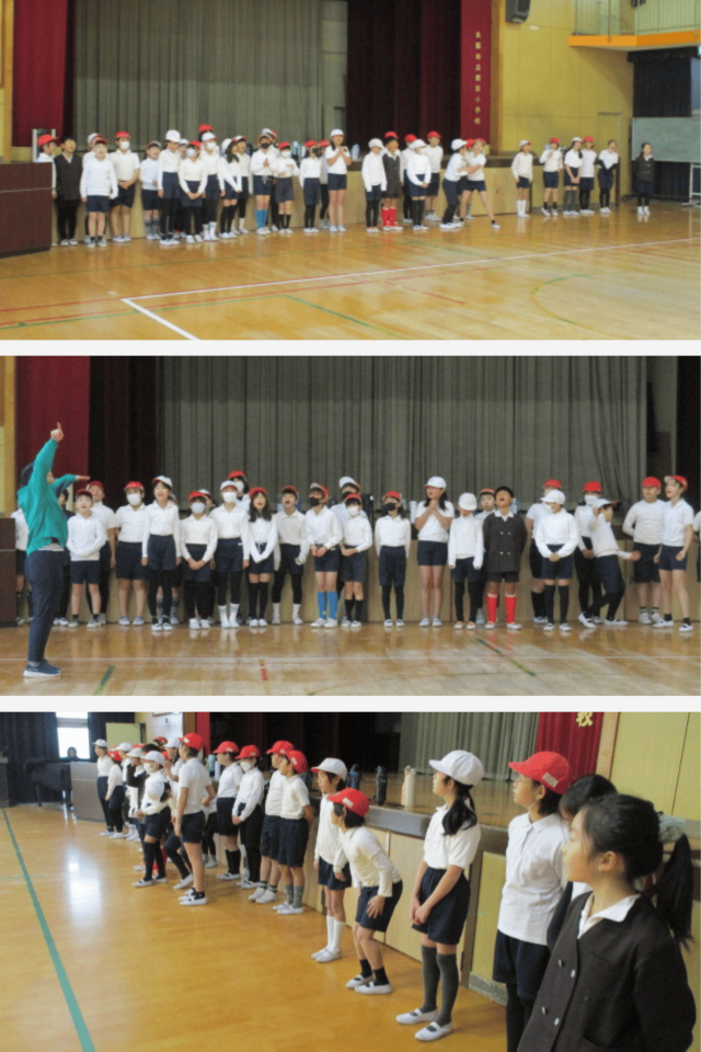 体育の学習の前に、講堂で合唱曲「うたえ!あかんたれ」の練習をしました。