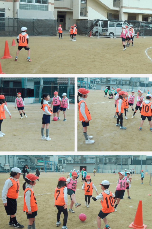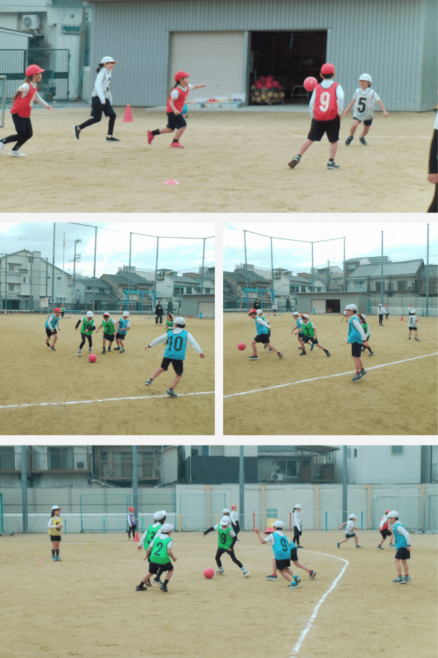 チームに分かれ、声をかけ合いながらボールを追いかけ、協力してプレーしていました。