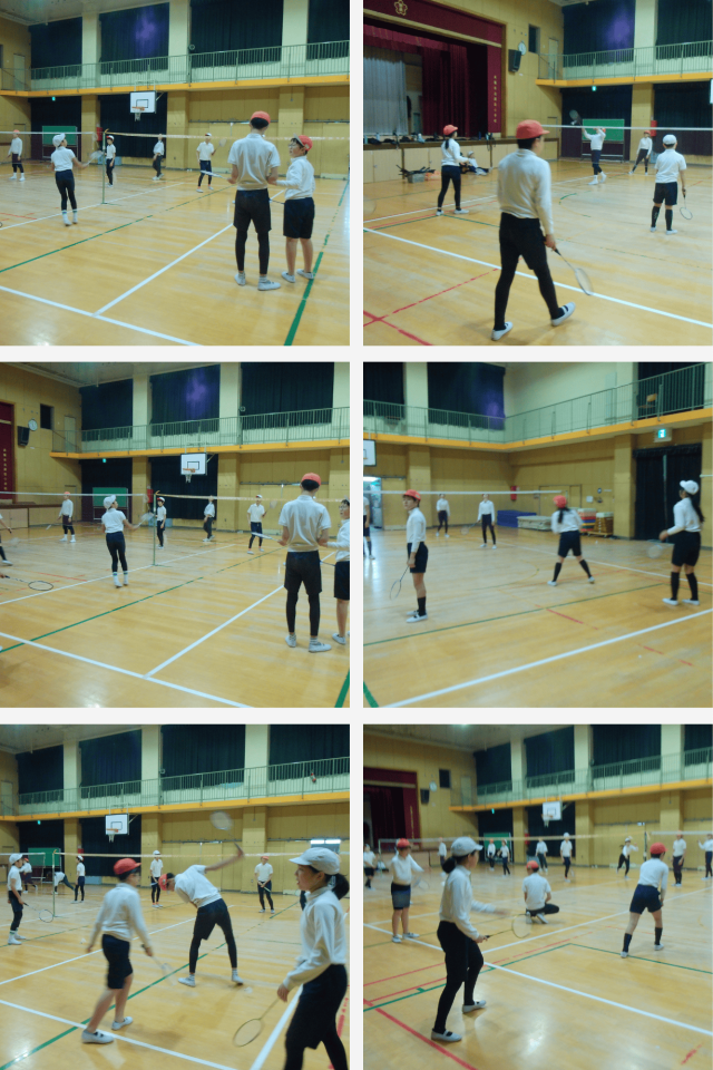 体育の時間にバドミントンの練習をしています。