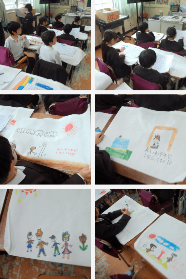袋の表紙には、名前を書いたり、絵を描いたりして、それぞれ工夫をこらした作品袋が完成しました。