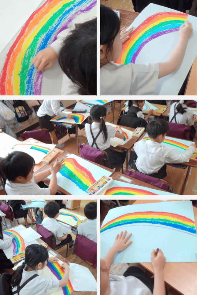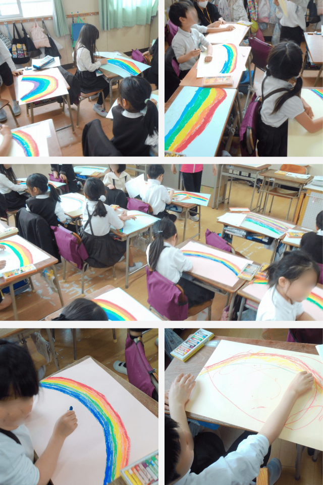 色とりどりのにじが広がり、教室の中もなんだか明るい雰囲気になりました。