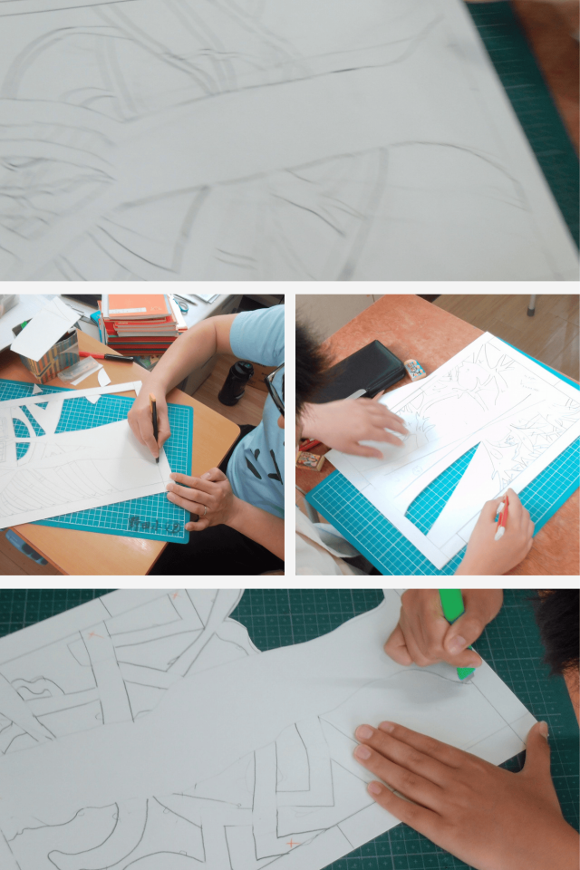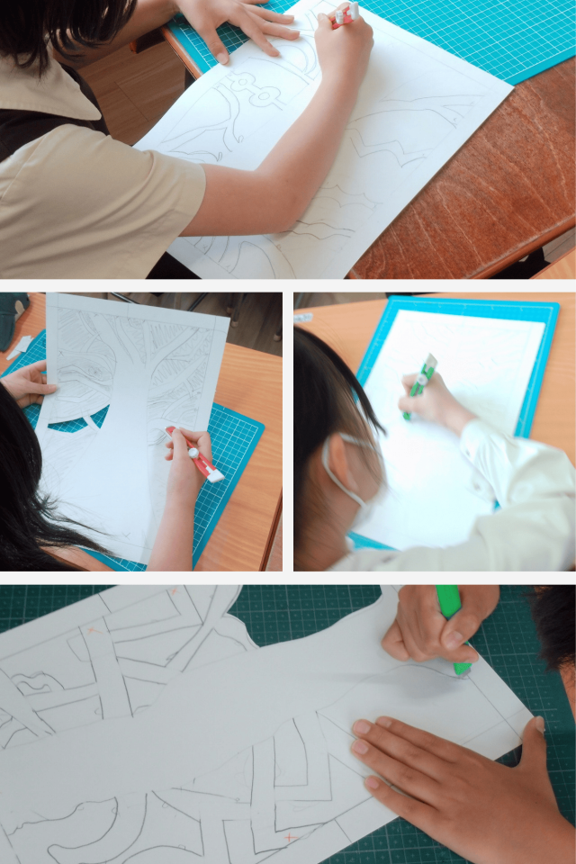 カッターナイフを使う場面では、安全に気をつけながら、ゆっくりとていねいに線を切り出していきました。