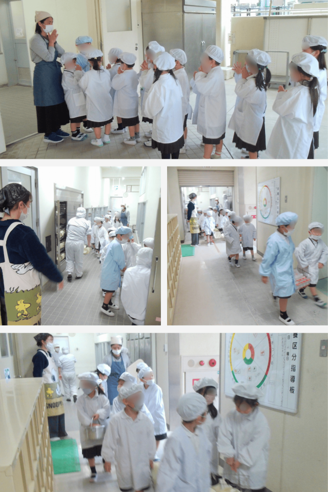 給食着に着替えて給食室へ向かい、友だちと声をかけ合いながら、食缶や食器を運ぶ姿が見られました。