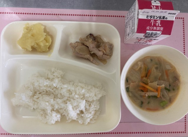 1/26(月)の給食は、ごはん、牛乳、鶏肉の塩こうじ焼き、かす汁、くりきんとんです。