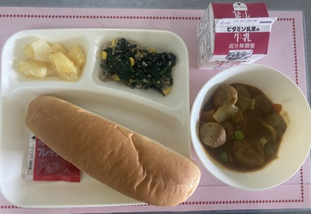 1/27(火)の給食は、コッペパン、いちごジャム、牛乳、ミートボールと野菜のカレー煮、ツナとほうれん草のソテー、パインアップルです。